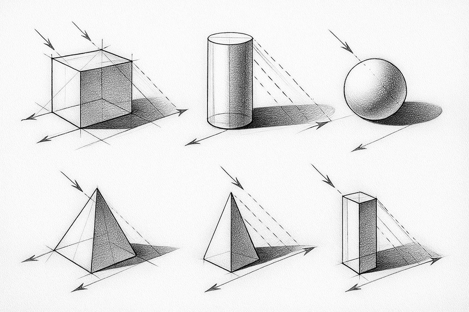Tập vẽ cube (khối lập phương), sphere (khối cầu), cylinder (khối trụ) để làm quen khối – sáng tối.